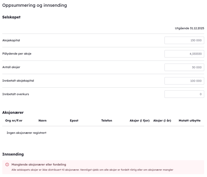 - Etter du har godkjent blir du automatisk tatt tilbake til modulen, hvor du kan klikke på “Send inn” for å levere Aksjonærregisteroppgaven