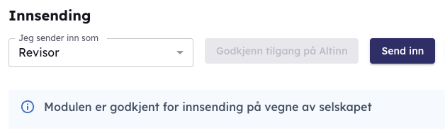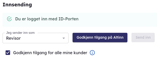- Hvis modulen ikke er godkjent fra før må du klikke på “Godkjenn tilgang på Altinn”. Du blir da tatt videre til Altinn hvor du må logge på med ID-porten for å godkjenne tilgangen. (godkjenning krever rettigheten “Tilgangsstyrer” på selskapet i Altinn, som kun Daglig leder og styreleder har som standard)