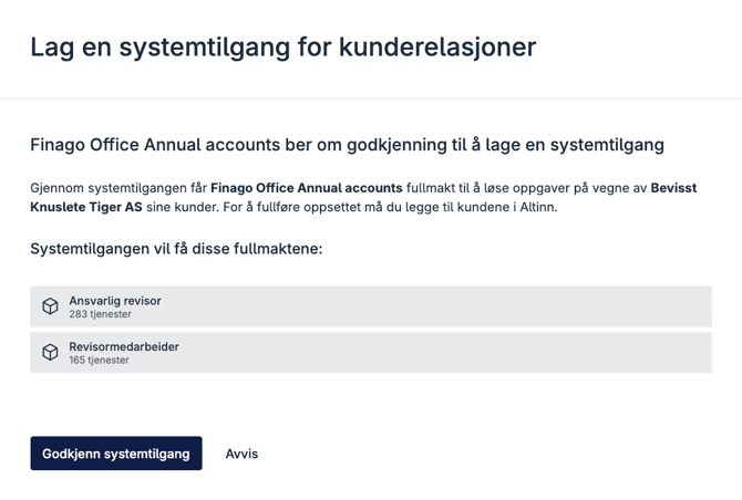 NB! Godkjenning krever rettigheten “Tilgangsstyrer” i Altinn på selskapet som er registrert som regnskapsfører eller revisor. Som standard er det kun daglig leder og styreleder som har denne rettigheten