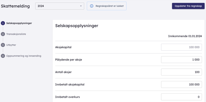 Første året du bruker modulen må innkommende verdier for Aksjekapital, Pålydende per aksje, Antall aksjer, Innbetalt aksjekapital og Innbetalt overkurs legges inn. Er selskapet stiftet i løpet av året det skal rapporteres for er inngående verdier «0» og ikke mulig å endre. Verdiene settes da i steget for stiftelse. Påfølgende år vil inngående verdier hentes fra utgående verdier for fjoråret.
