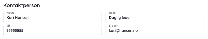 Kontaktperson med alle tilhørende felter er obligatorisk informasjon som må sendes inn med oppgaven. Systemet foreslår verdier fra fjoråret eller “Navn” og “E-post" fra innlogget bruker hvis det er første året modulen benyttes.