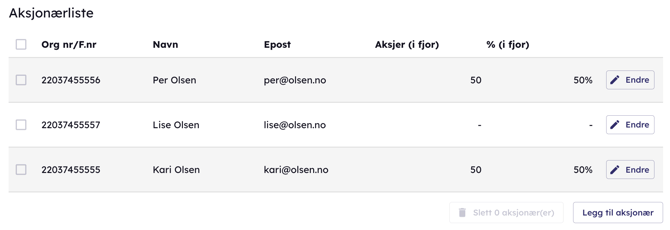 Er selskapet stiftet inneværende år, det er første gang man bruker modulen eller nye aksjonærer som har tilkommet i løpet av året, legges aksjonærene inn her. For påfølgende år vil aksjonærene fra i fjor hentes inn automatisk fra utgående informasjon fra fjoråret fra modulen.