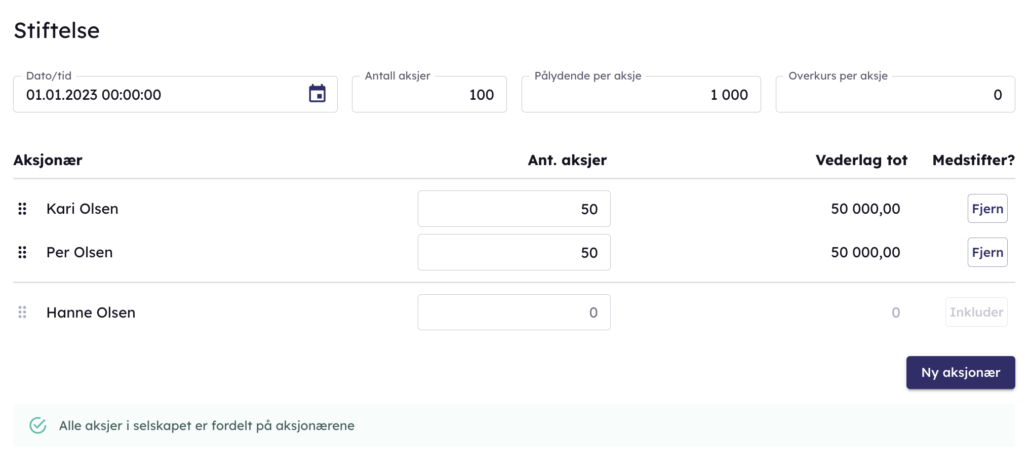- Deretter fordeles aksjene mellom stifterne ved å klikke på Inkluder/Fjern, eller dra og slipp over eller under streken. Alle aksjene må fordeles, men det kan være aksjonærer som ikke deltok på stiftelsen som er lagt inn grunnet deltakelse i emisjon eller kjøp av aksjer etter stiftelsen.
