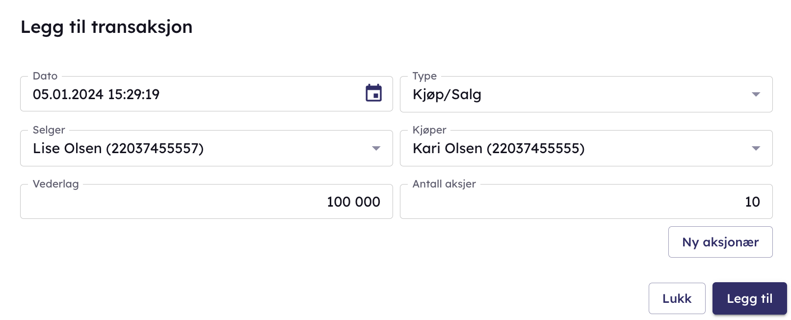 Etter du har valgt tidspunkt og kjøp/salg, velger du hvem som er selger og kjøper fra nedtrekksmenyene. Legg så inn vederlag for transaksjonen og antall aksjer og klikk “Legg til”.