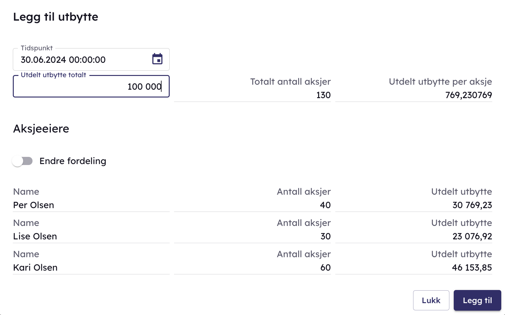 - Velg først tidspunkt og utdelt utbytte totalt for alle aksjonærer for dette utbyttet.