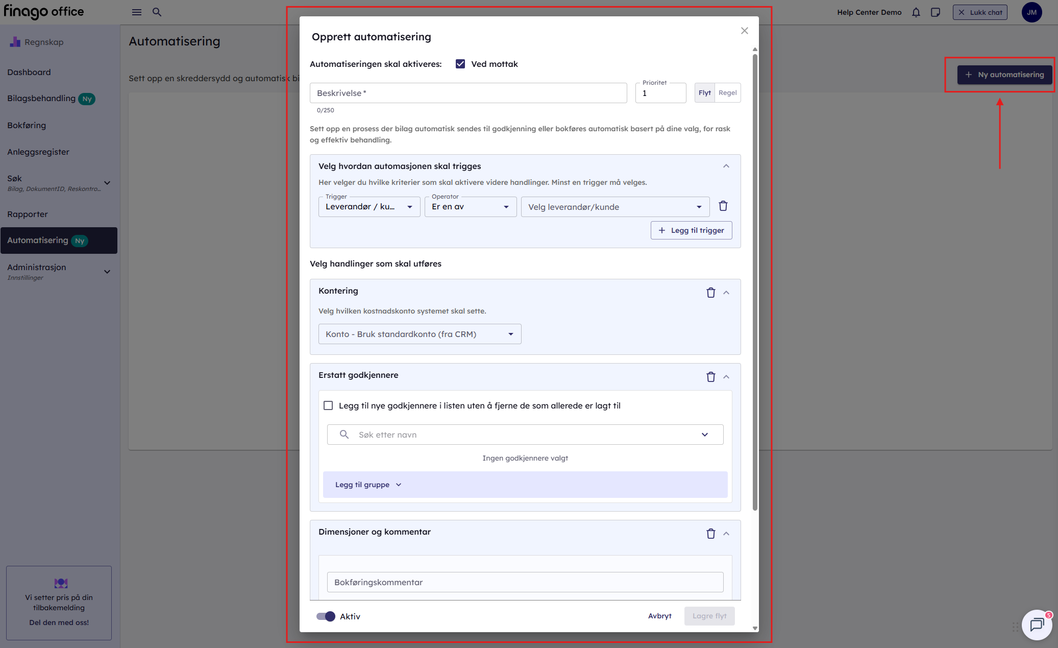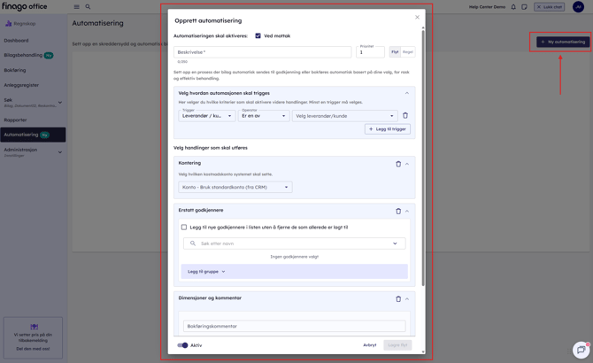 Gå til Bilagsbehandling → Automatisering → Ny automatisering