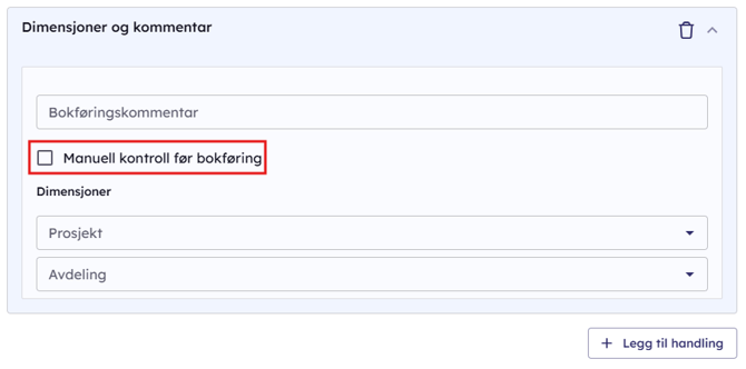 Hvis du aktiverer Manuell kontroll før bokføring, vil bilaget stoppes for kontroll før det bokføres.