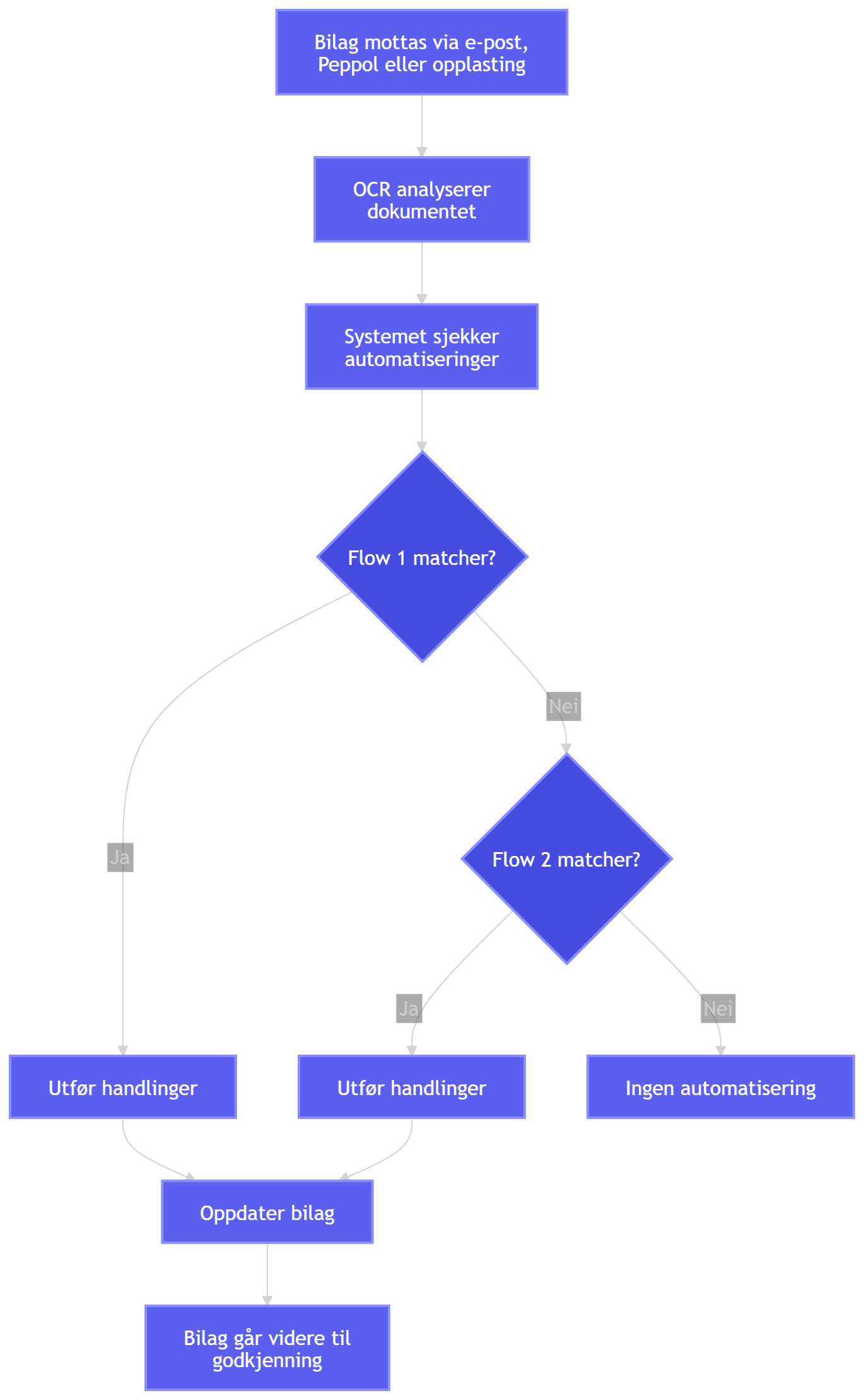 Flyt og regler (flows) er automatiserte regler som håndterer bilag basert på bestemte betingelser. Når et bilag oppfyller kriteriene i en Flow, vil systemet automatisk utføre handlinger som for eksempel: