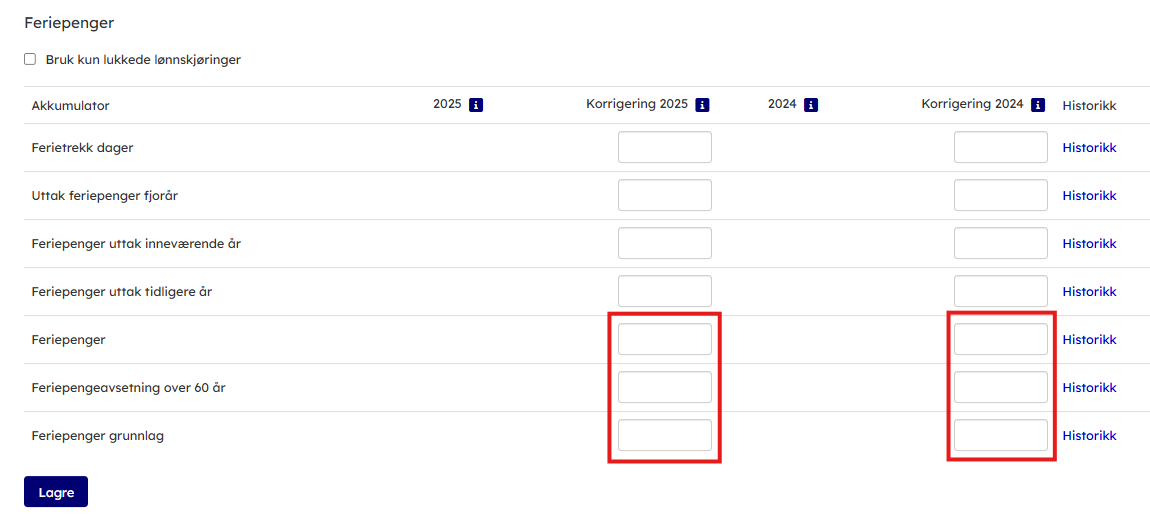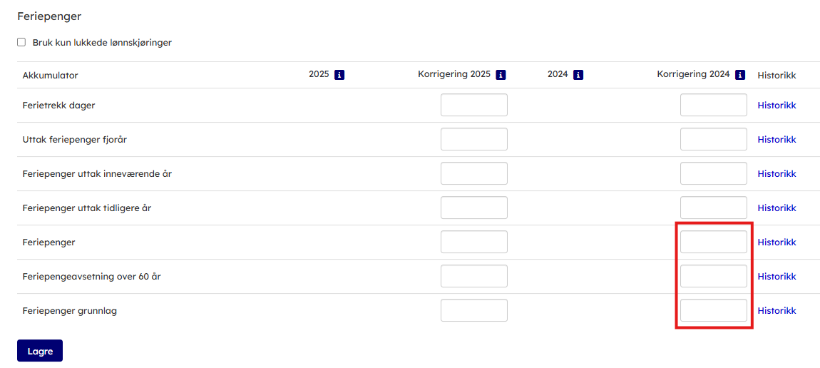 - Er deler av feriepengene fra forrige år utbetalt, legges dette inn i “feriepenger uttak inneværende år” i Korrigering kolonnen til høyre