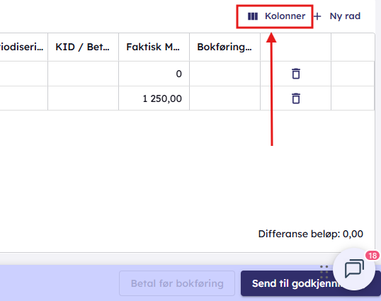 Du kan endre rekkefølgen på kolonnene i kontering ved Kontoføringer. Helt til høyre har man to knapper som "Kolonner" og "+ ny rad". Da klikker du på "Kolonner".