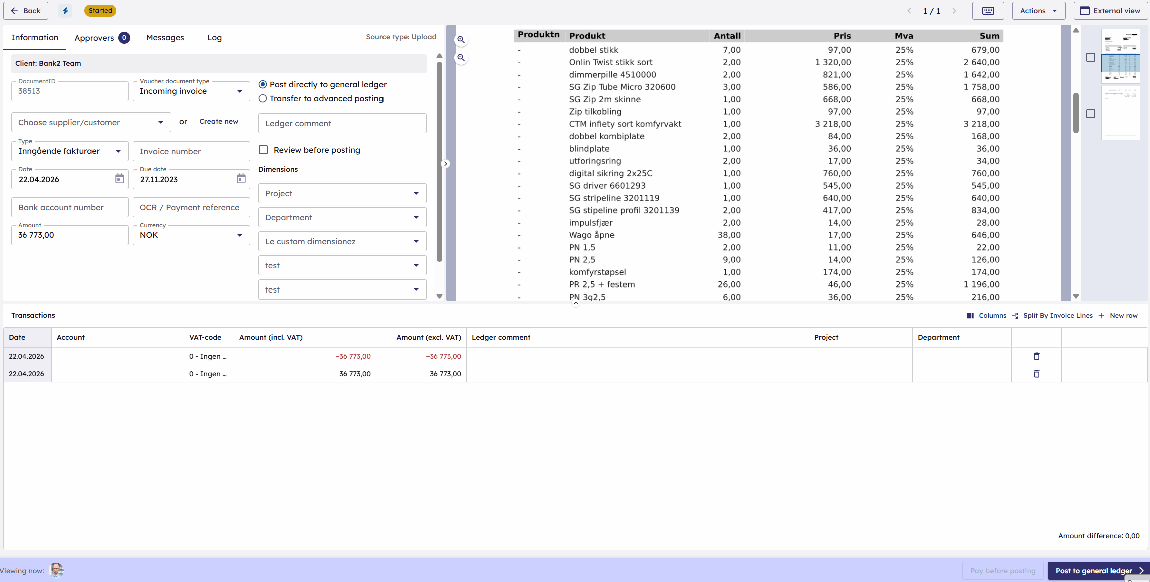 - Kontrollere bilagsinformasjon, leverandør, datoer og dimensjoner