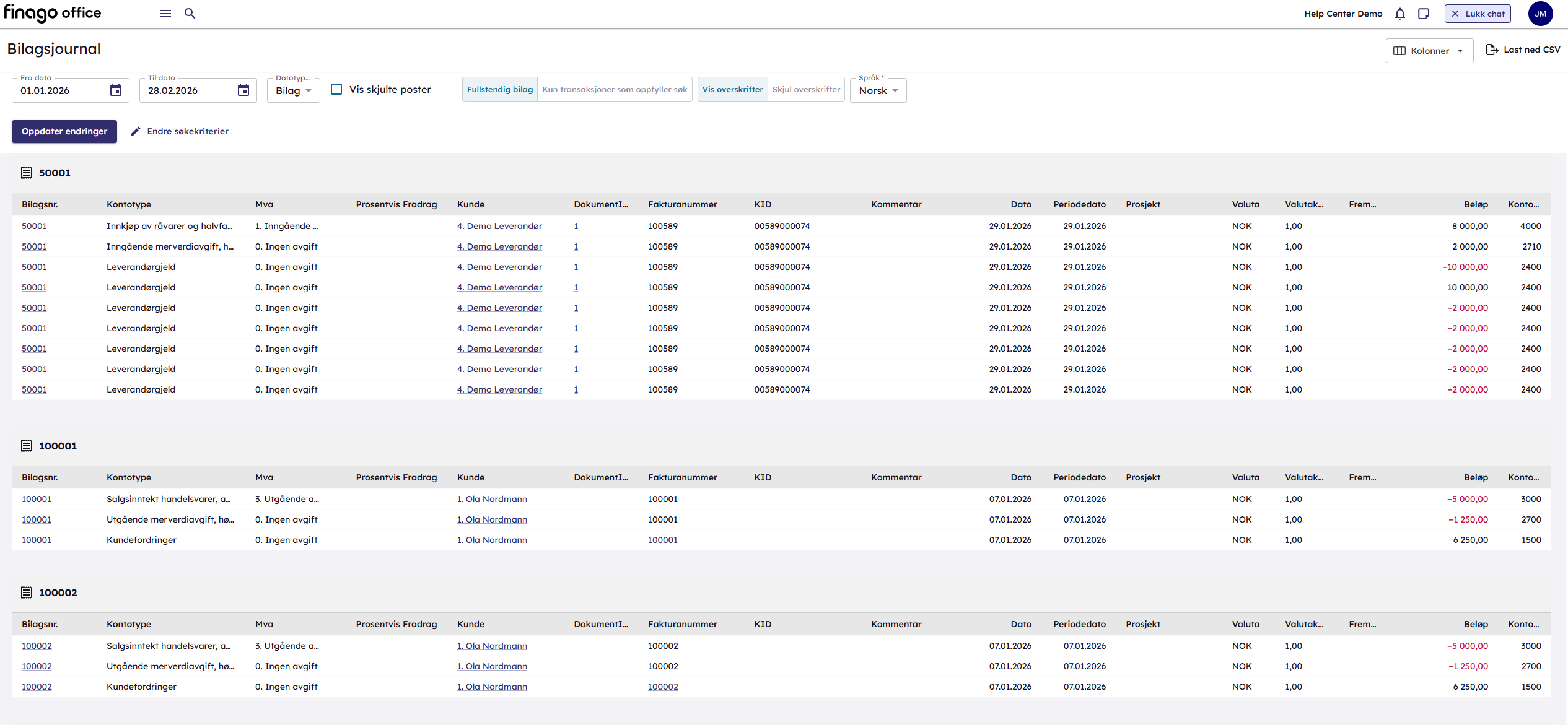 Denne rapporten viser alle bilag ført på firmaet.