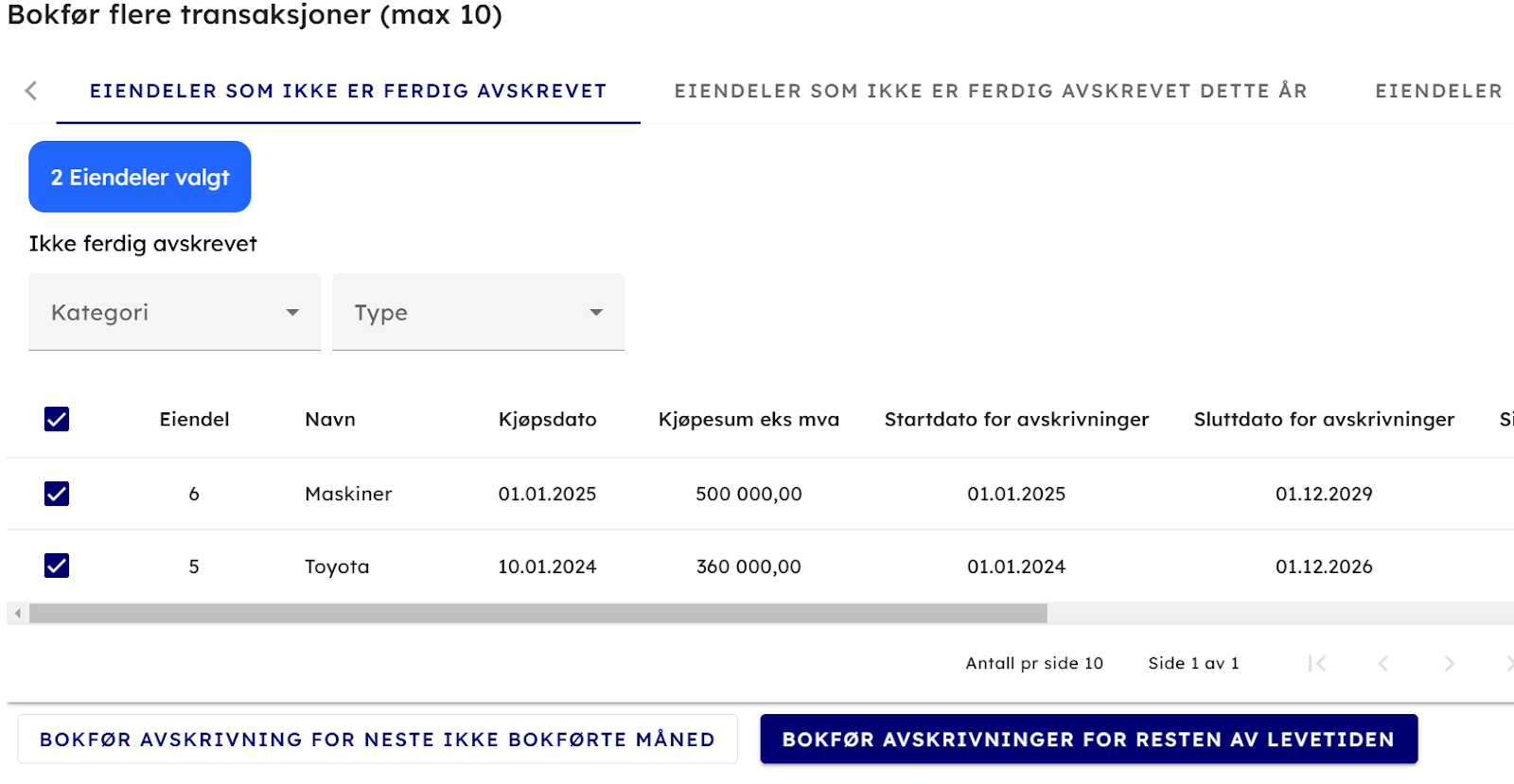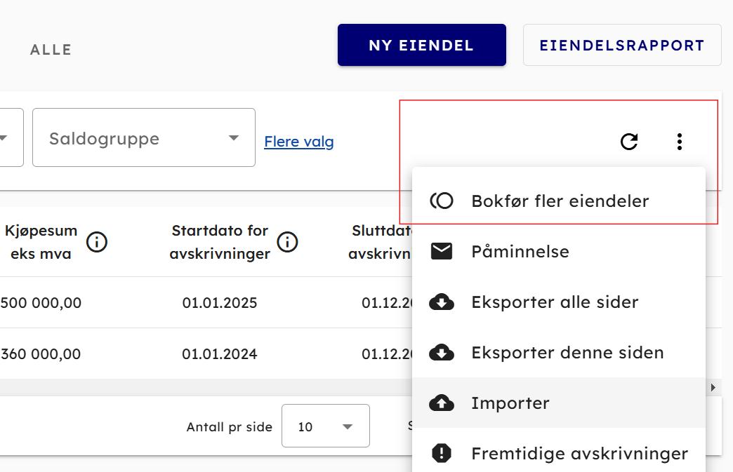 Under menyen oppe til høyre har en funksjonen «Bokfør fler eiendeler», her kan en bokføre flere avskrivninger ved bare et klikk. Vi har satt opp en maks grense for avskrivninger av eiendeler og det er 10 stk, dette er gjort med tanke på ytelse.