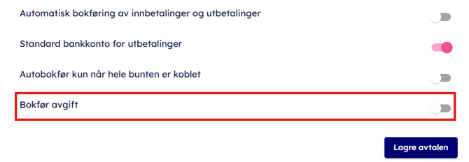 Har du en slik løsning, kan du slå av denne innstillingen. Da vil vi ikke lese inn gebyrbeløpet på transaksjonen, og du kan bokføre som normalt.