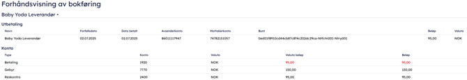 Du har betalt 95 kr, og det er registrert et gebyr på 150 kr. Gebyret er imidlertid ikke trukket på denne transaksjonen, men samles opp i banken.