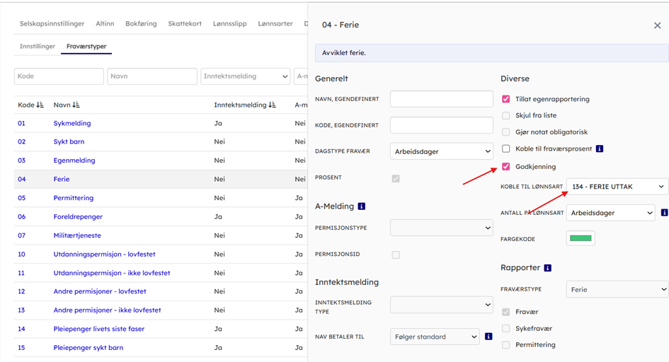 I dette eksempelet har vi satt opp at fraværstypen Ferie skal godkjennes og generere lønnspost på lønnsart 134 – Ferie uttak.