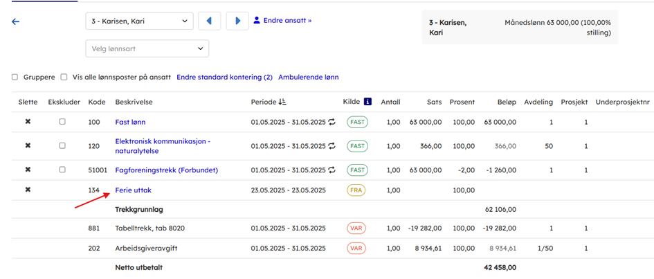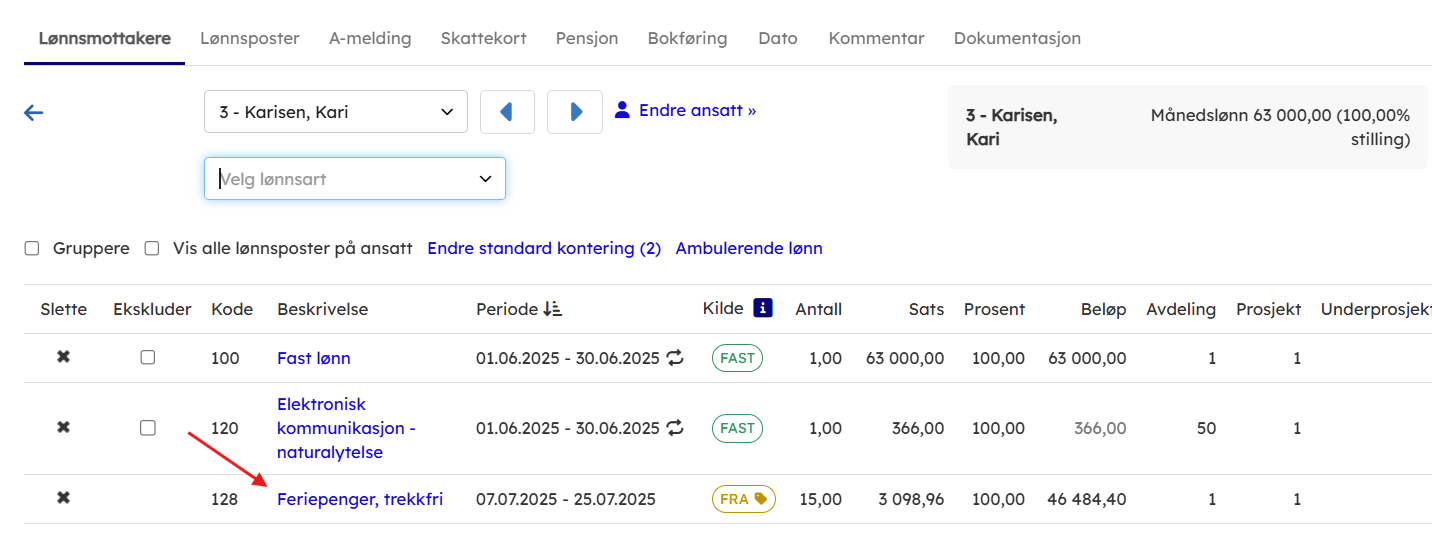 Når Ferie er godkjent og overfør til lønnskjøring blir lønnsarten liggende som lønnspost.