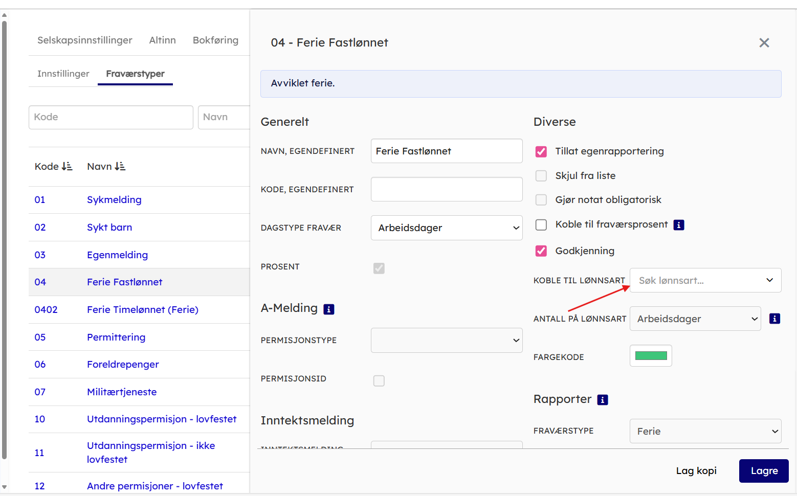 Man kan også koble opp fraværstypen mot lønnsart, slik at det opprettes lønnspost når fraværet er godkjent og overført til lønnskjøring.