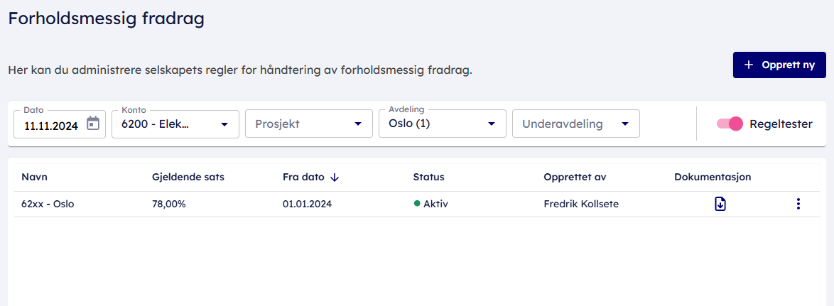 Regeltesteren er perfekt for deg som ønsker å verifisere oppsett før bokføring tar plass, eller raskt finne hvilken regel som har blitt trigget, basert på en bokført kostnad.