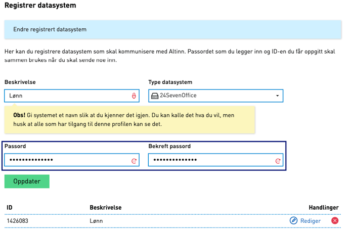 - Under Registrer datasystem så finner du system ID'en som er opprettet for 24SevenOffice. Trykk på rediger og legg inn passordet på nytt.