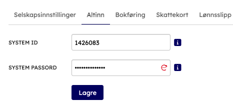 - Gå inn på 24SO Lønn og videre til Administrasjon - Innstillinger - Altinn. Lim inn system ID og nytt system passord.