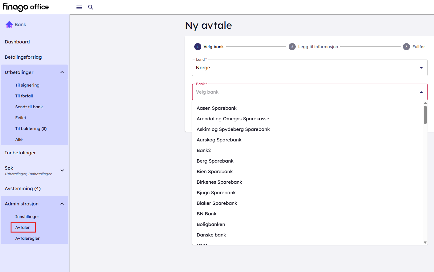 Gå til Dashboard → Bank → Avtaler. Klik deretter på "+ Ny avtale". Under Bank-rullegardinen har du til enhver tid full oversikt over hvilke banker vi kan integreres mot: