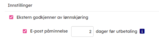 - Aktivér Ekstern godkjenner av lønnskjøring og velg om det skal sendes en e-post påminnelse til godkjenner X antall dager før en lønnskjøring.