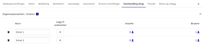 - Gå til Administrasjon → Innstillinger → Samhandling (Org) → Organisasjonsenhet/Struktur. Her kan man legge opp enhetene eller strukturen i selskapet som skal gjelde for godkjenning. I brukeroversikten kan man tildele en godkjenner tilgang til en organisasjonsenhet og dermed fungere som godkjenner for enheten. Det anbefales å legge rollen godkjenner på organisasjonsnivå og ikke på selskapsnivå som da vil ha tilgang til hele selskapet.