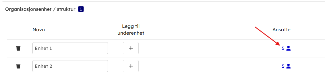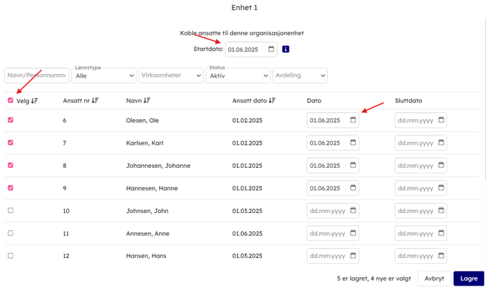 - Knytt ansatte til riktig organisasjonsenhet ved å trykke på menneske-ikonet. Marker ansatte og sett fra dato, deretter Lagre.