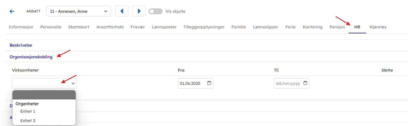En ansatt kan også kobles til organisasjon via Ansattkortet. Gå til Ansattkortet → HR → Organisasjonkobling. Velg enhet, sett fra-dato og Lagre.