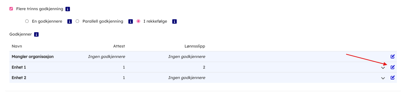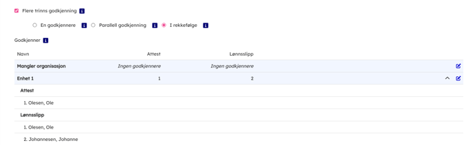 I mitt eksempel har jeg satt opp at det kun er Ole som attesterer reiser, utlegg og fravær, men at både Ole og Johanne må godkjenne lønnsslipper i gitt rekkefølge på Enhet 1.
