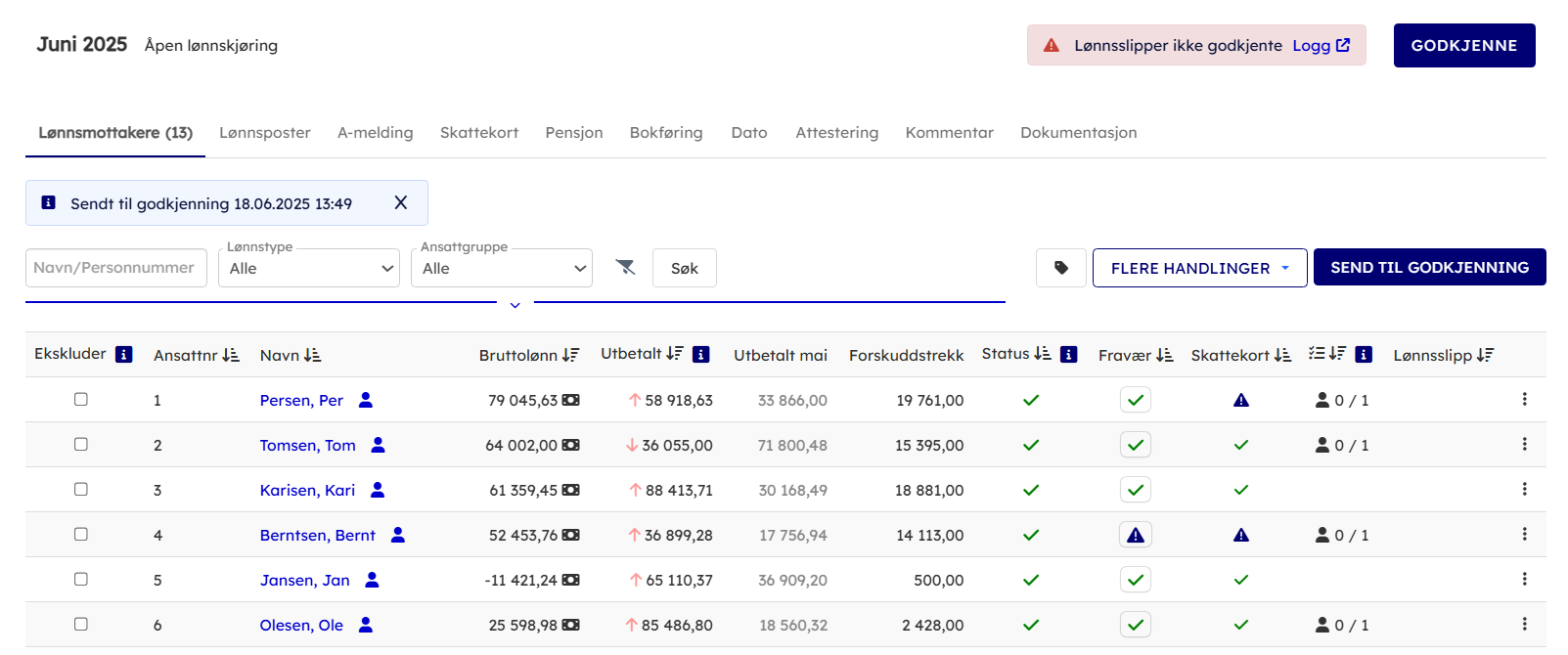 - Lønnsfører har full oversikt over hvem som er godkjent og hvem som mangler godkjenning.