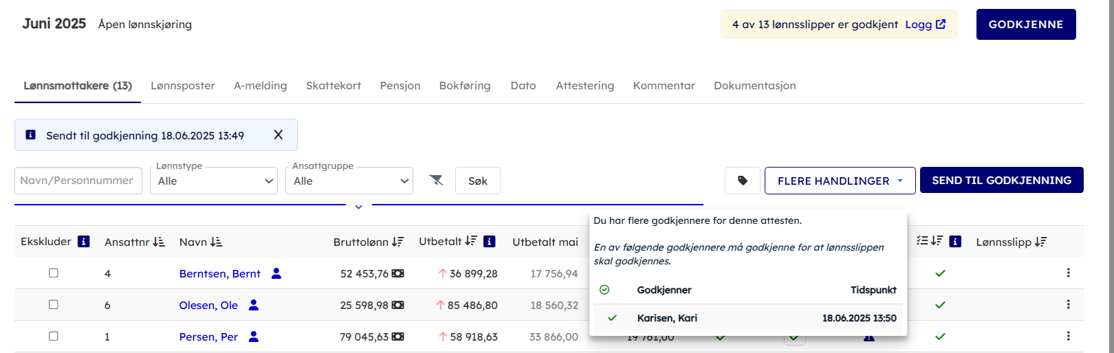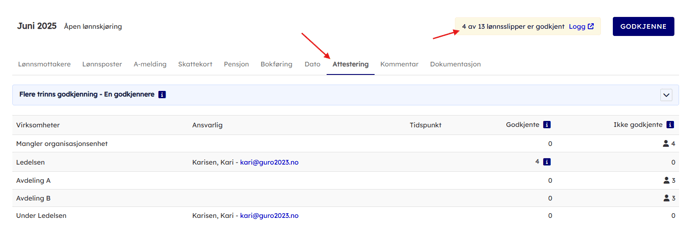 - Lønnsfører kan se alle godkjennere og status på hvem som er godkjent og ikke godkjent i fanen Attestering i lønnskjøringen.