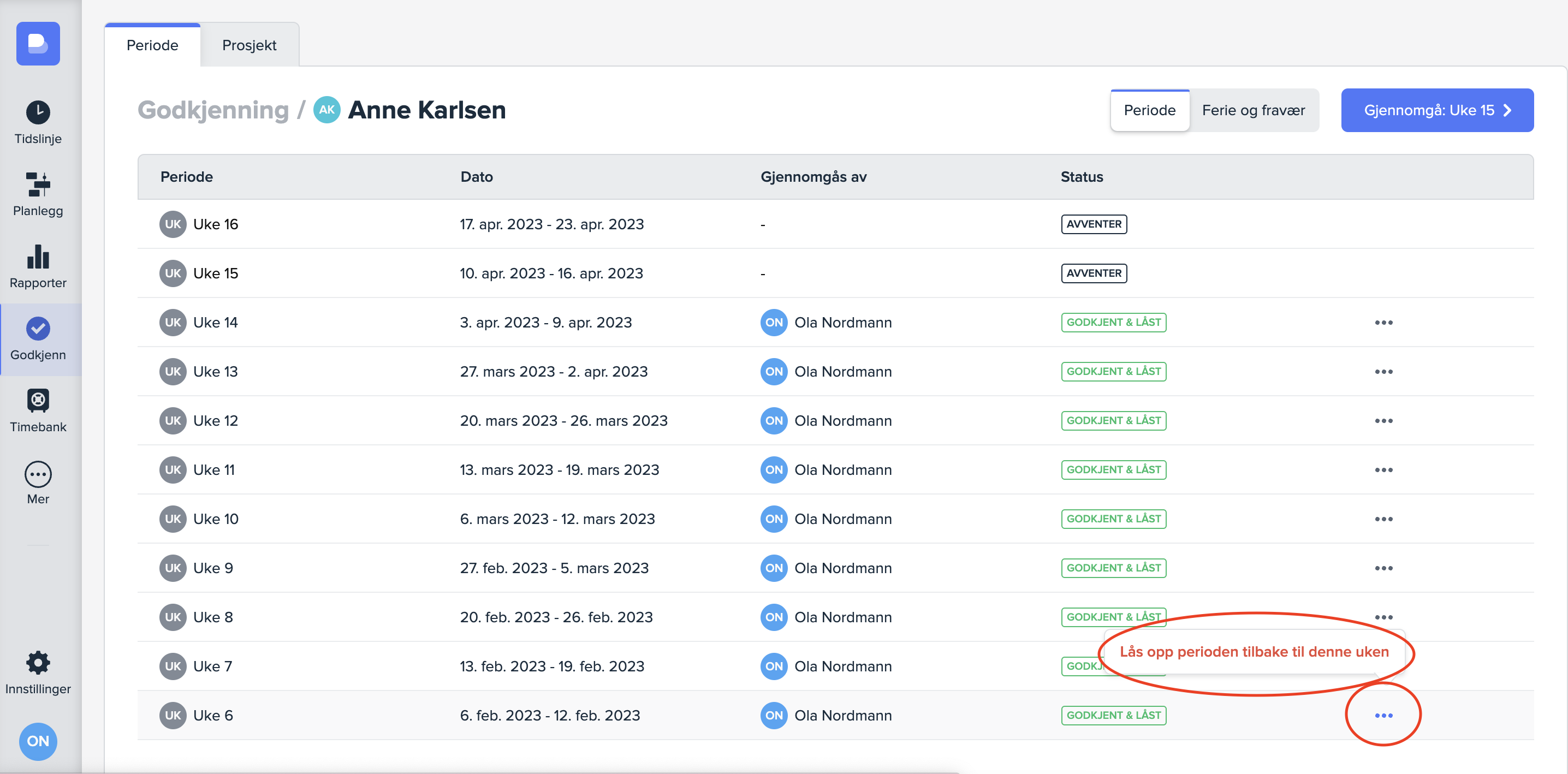 I det neste vinduet vil du se hvilke perioder som er godkjente og låst, og hvilke som enda ikke er gjennomgått. Du vil også se hvem som eventuelt har godkjent de. For å åpne periodene, trykk på de tre prikkene ved siden av uken du ønsker å låse opp fra: