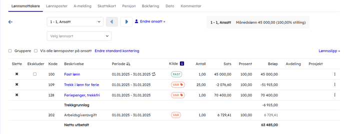 - Lønnsart 109 trekk i lønn for ferie, og lønnsart 110 trekk i lønn for ferie over 60 år om ansatt er over 60 år.
