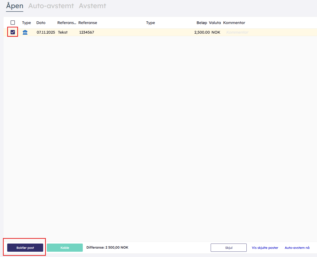Markér posten du ønsker å bokføre og trykk på bokfør post.