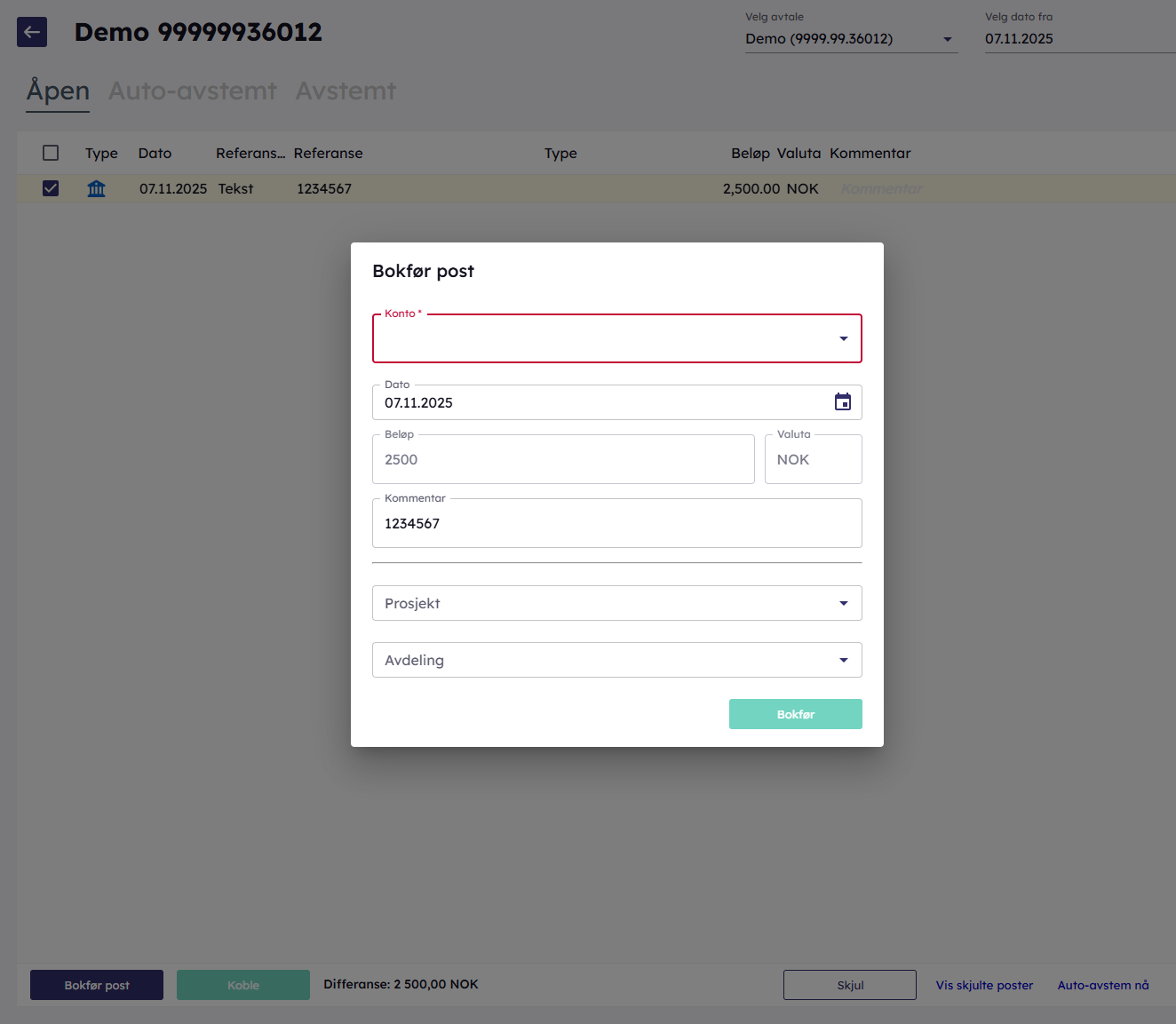 OBS! Kunde- og leverandørreskontro kontoene er ikke mulig å føre mot via avstemming, heller ikke kontoer som har påkrevd prosjekt eller avdeling.