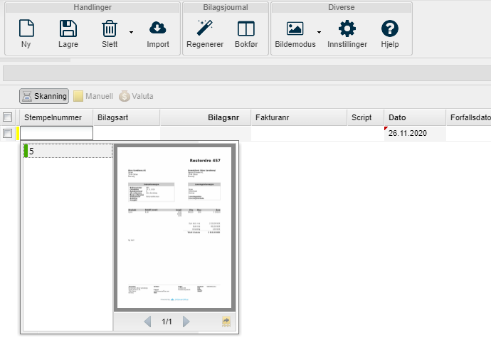 Fyll ut resten av informasjon om bilaget. Klikk her for informasjon om hurtigtaster for bokføring.