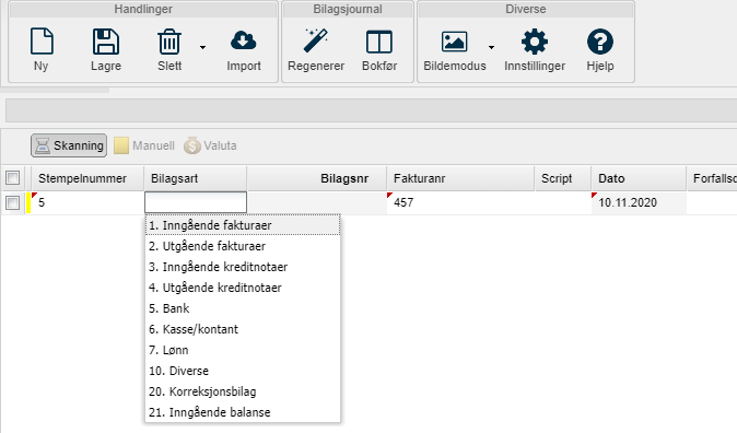 - Velg bilagsart som du bruker for leverandørfaktura.