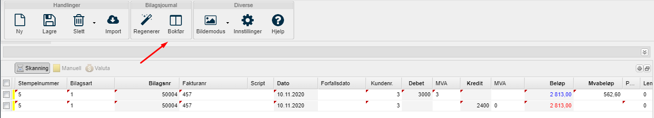 Etter at en faktura er blitt registrert i mottaket skal den bokføres. Du kan bokføre faktura direkte i mottaket, men i denne hjelpeartiklen går vi igjennom hvordan du bokfører en leverandørfaktura via bokføringsmodulen.