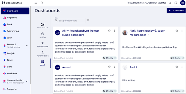 Et alternativ til å skreddersy dashboards fra bunnen av, er å ta utgangspunkt i offisielle dashboards skapt av 24SevenOffice eller oppsett som andre brukere har delt og gjort tilgjengelige for andre. Nedenfor beskriver vi hvordan du kan gjøre dette