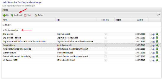 Dersom man ønsker å forandre på en av standardmalene så gjøres dette ved at man først markerer malen som skal endres på, og deretter klikker på «Last ned». Vi anbefaler bruk av LibreOffice Writer som fakturadesign-editor.