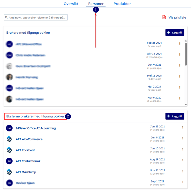 Velg fanen Personer (1) og finn listen over Eksterne brukere med tilgangspakker (2). Ved best practice skal disse brukerne ha navnet til tredjeparten de er satt opp mot.