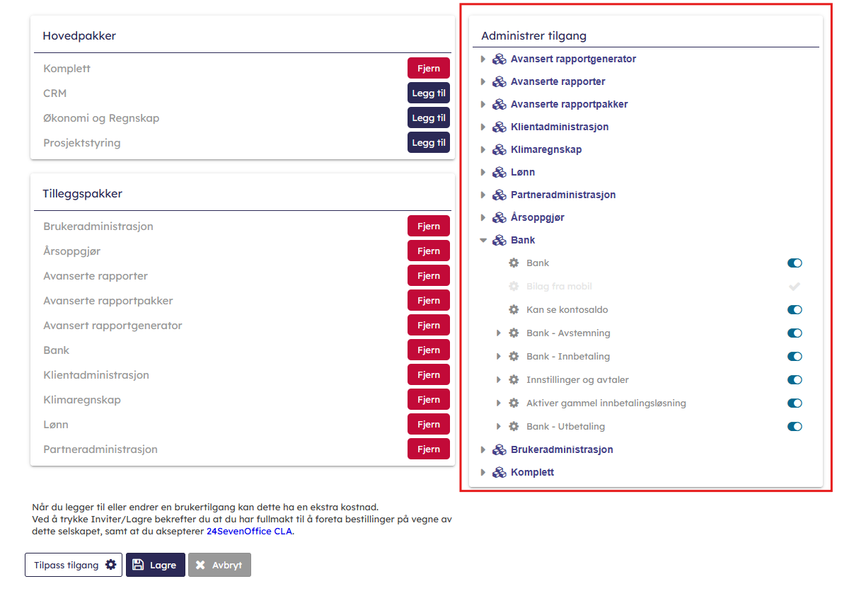 Da kan du detaljstyre hvilke tilganger brukeren skal ha, og se hvordan tilgangene endres basert på de ulike pakkene.