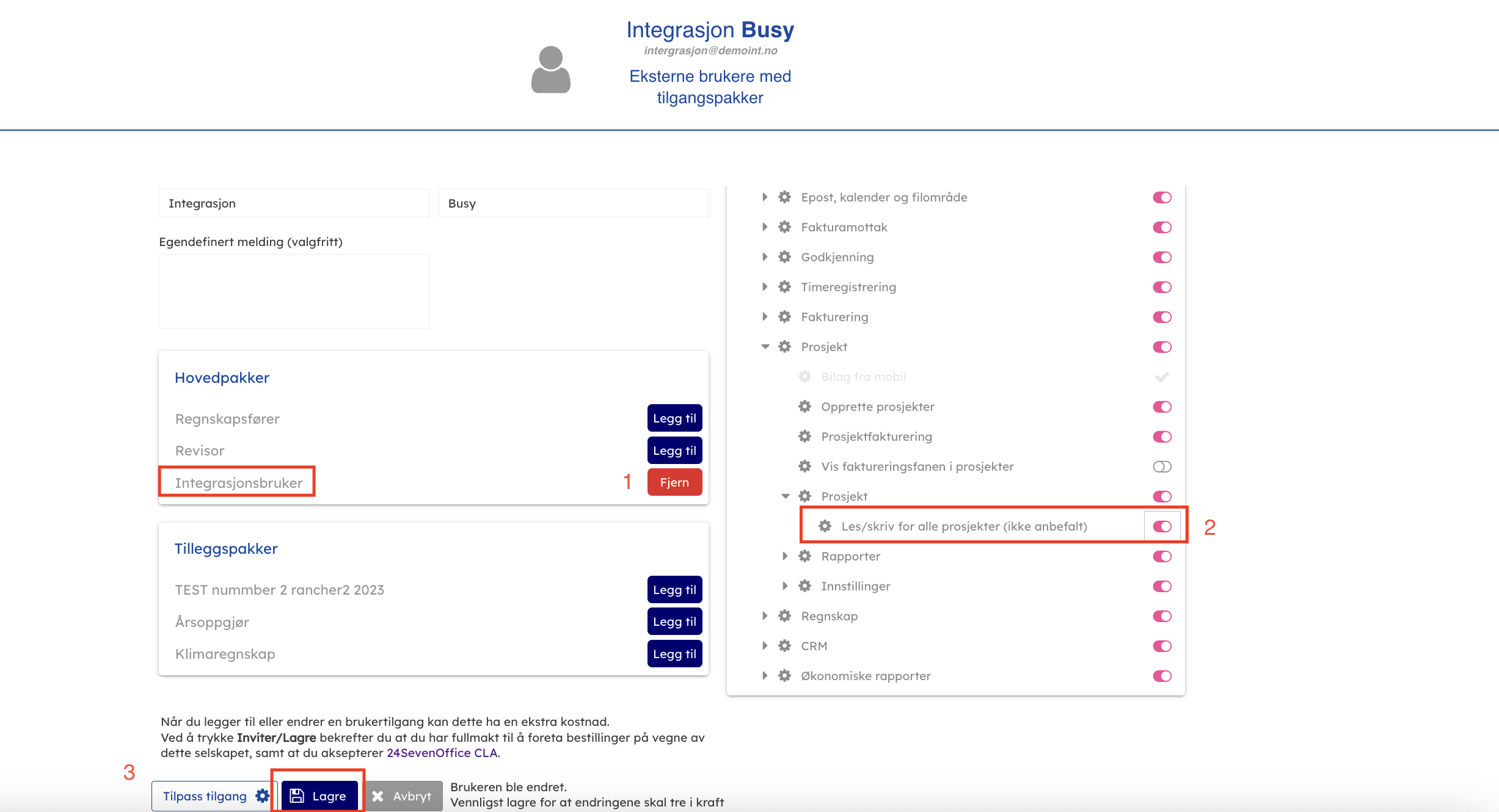 Under ser du et bilde med forklaringer på hvordan man sørger for at integrasjonsbrukeren har alle nødvendige tilganger: