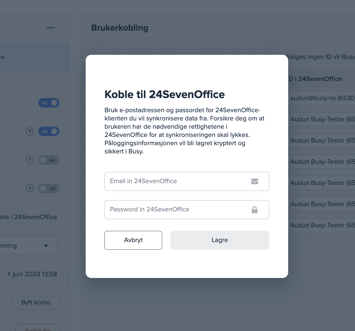 Trykk «Bytt konto» i Busy, og legg enten til en ny integrasjonsbruker eller oppdater informasjonen på den gamle.