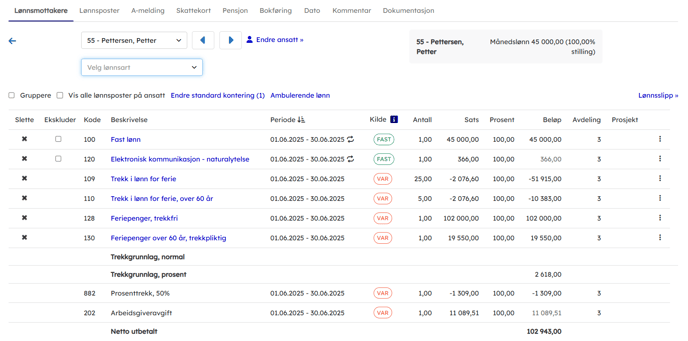 Ved behov kan man endre på lønnspostene, men husk at endringer i faste poster også vil endre seg på ansattkortet. - Klikk deg inn på en ansatt for å se alle genererte lønnsposter.