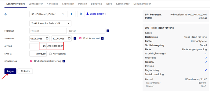 - Det trekkes som standard totalt antall dager i lønn for ferie. 25 dager for ansatte med feriepenger på 12%, 21 dager for ansatte med feriepenger på 10,2%. Er man over 60 år kommer et tillegg på 5 dager. Dersom du ønsker å overstyre antall dager som skal trekkes klikker du deg inn på lønnsarten Trekk i lønn for ferie og endrer antall slik som vist nedenfor.