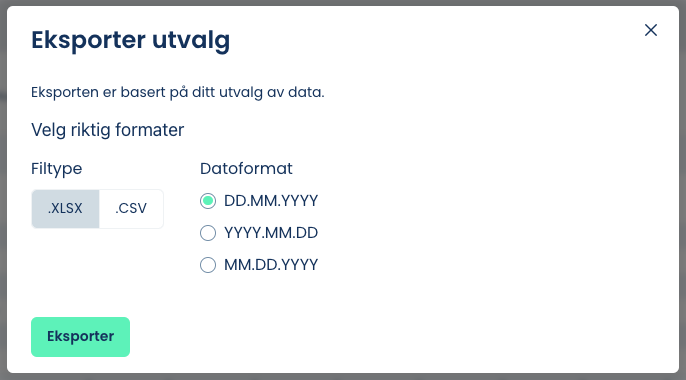 Her kan du velge mellom .XLSX eller .CSV - fil