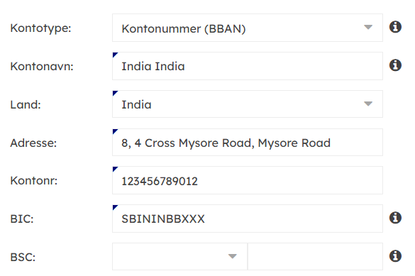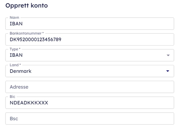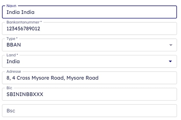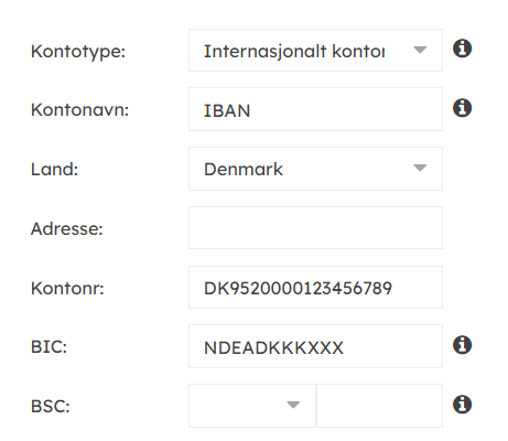 I CRM er det viktig at kunden dere skal betale til ligger inne med fullstendig informasjon i bankdetaljene. Du kan fylle ut dette enten på kunden i CRM eller direkte i bankmodulen, da skal det se slik ut: